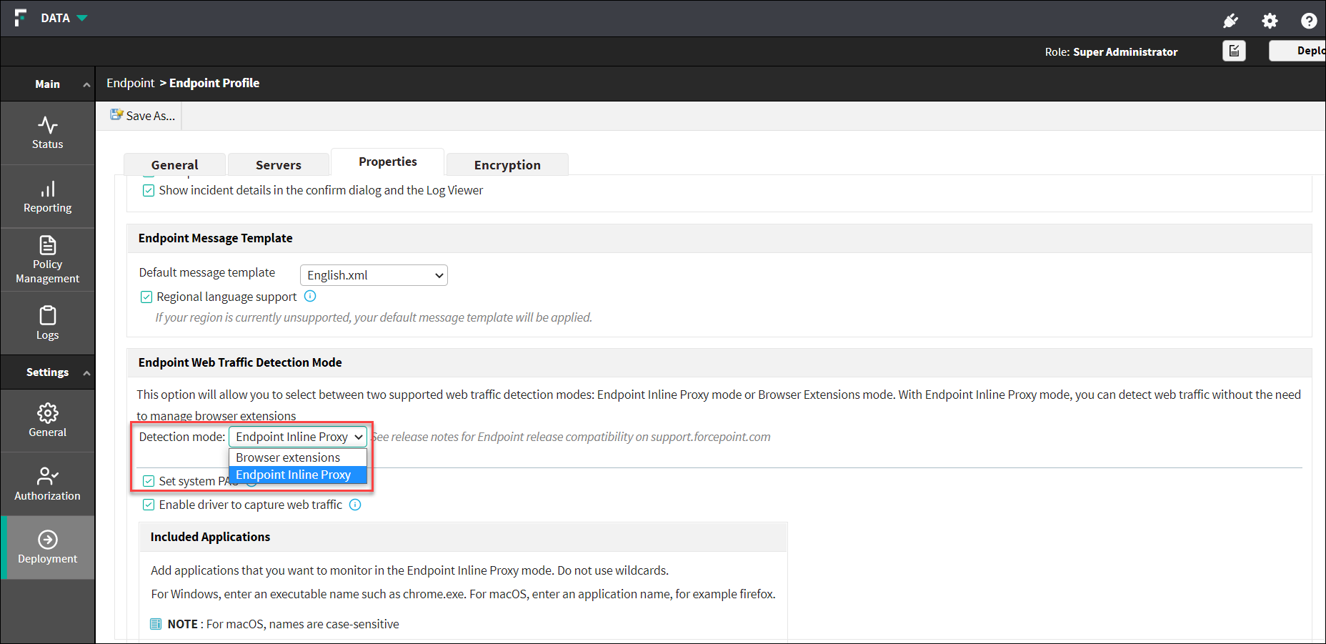 - Select Enable driver to capture web traffic - This setting is used to enable or disable the driver on the endpoint agent that is used to capture web traffic.