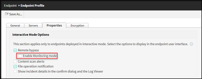 Enable Monitoring mode allows the endpoint to report incidents to the Forcepoint Security Manager (FSM) even when the endpoint is operating in bypass mode. This feature enables the security administrators to track the user activities when the endpoints are operating in bypass mode.