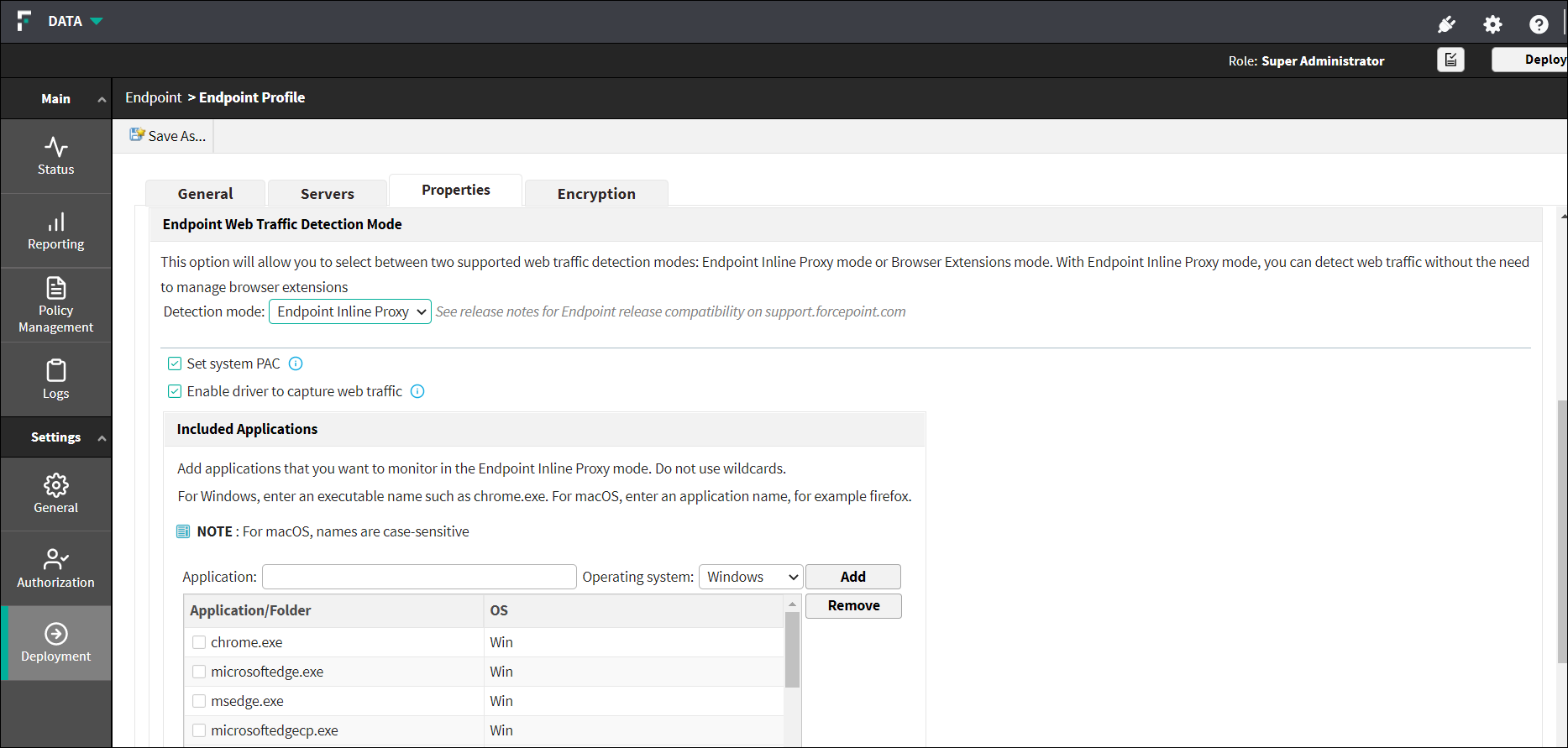 From Included Applications section, you can add the applications that you want to monitor in the Endpoint Inline Proxy mode.