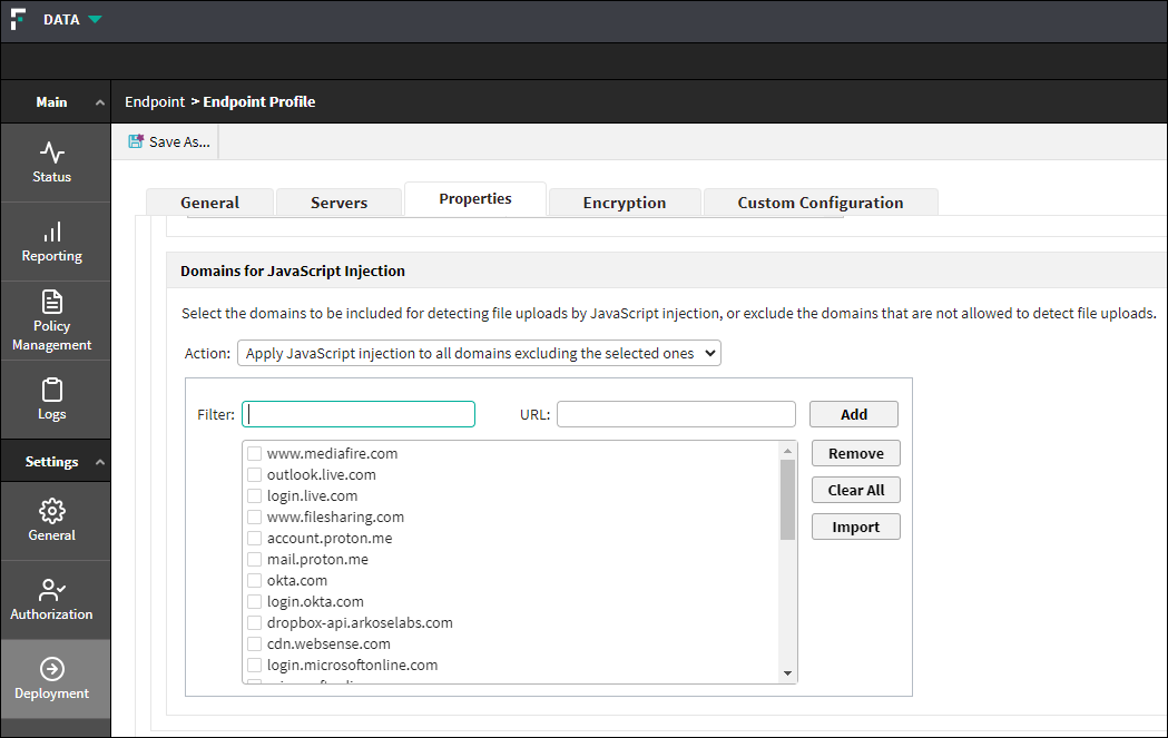 This feature enables an administrator to add/remove a domain to or from the domain list to be included or excluded from JavaScript Injection for detecting file uploads.