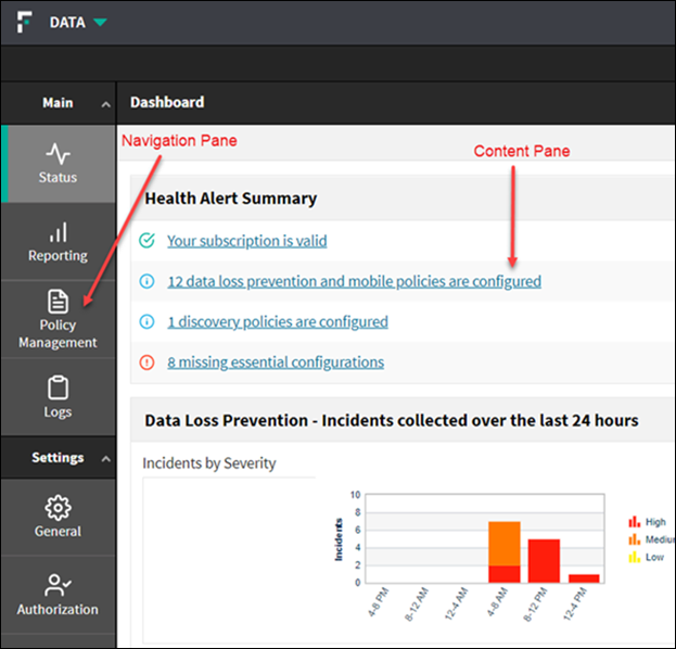 - The Dashboard is displayed in the content pane by default when an administrator logs on to the Data Security module of the Security Manager. It offers an overview of top Incident Risk Ranking cases, data loss prevention incidents, and discovery incidents over a specified time period. For details about the Dashboard and its contents, see Viewing the Dashboard section.