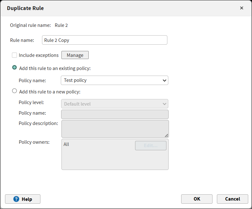 By default, the Add this rule to an existing policy option and the originally assigned policy name is selected.