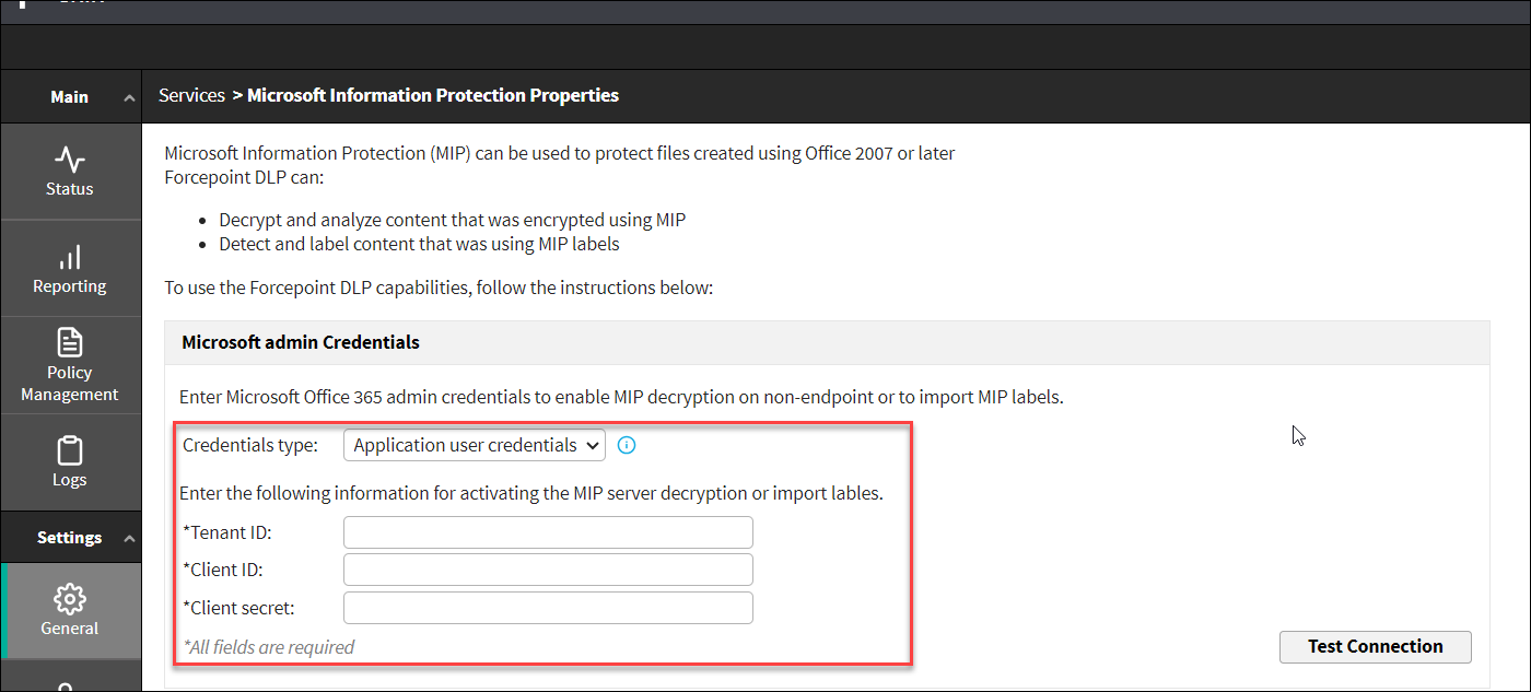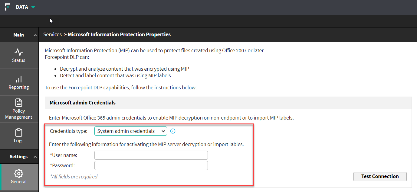 - System admin credentials - This option is used for importing the MIP labels only. This information is not stored on the Forcepoint servers.