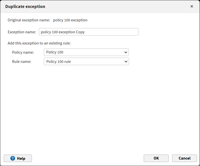 By default, the exception name displays as the original exception name appended with the word copy. You can enter a custom exception name up to 255 characters long. If it exceeds 255 characters (256 or more), an error message will be displayed.