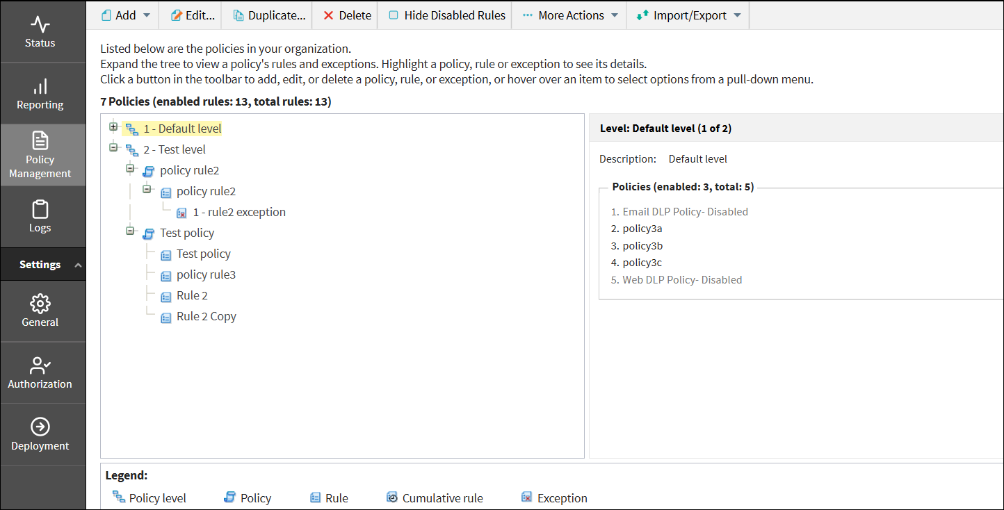 In Forcepoint Security Manager (FSM), go to Main > Policy Management > DLP Policies or Discovery Policies > Manage Policies.
