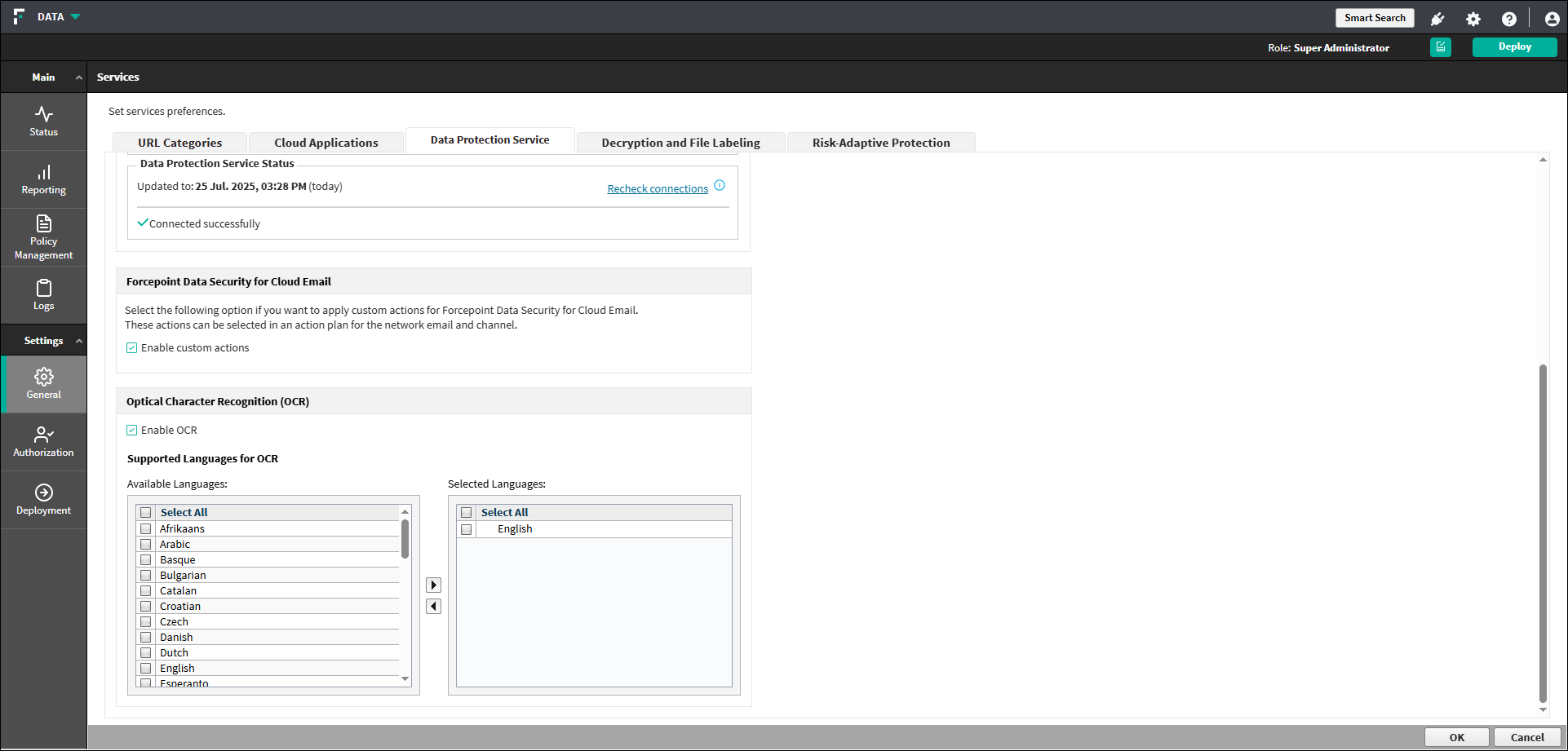 You can enable OCR and select the desired languages from the supported language list.Note: The maximum file size that can be scanned by OCR is 25MB, and the,minimum is