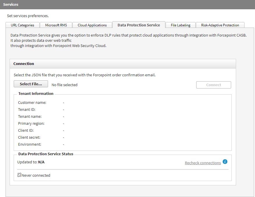 When the connection is active, the Connect button turns into a Disconnect button, enabling disconnection of Data Protection Service from Forcepoint DLP.
