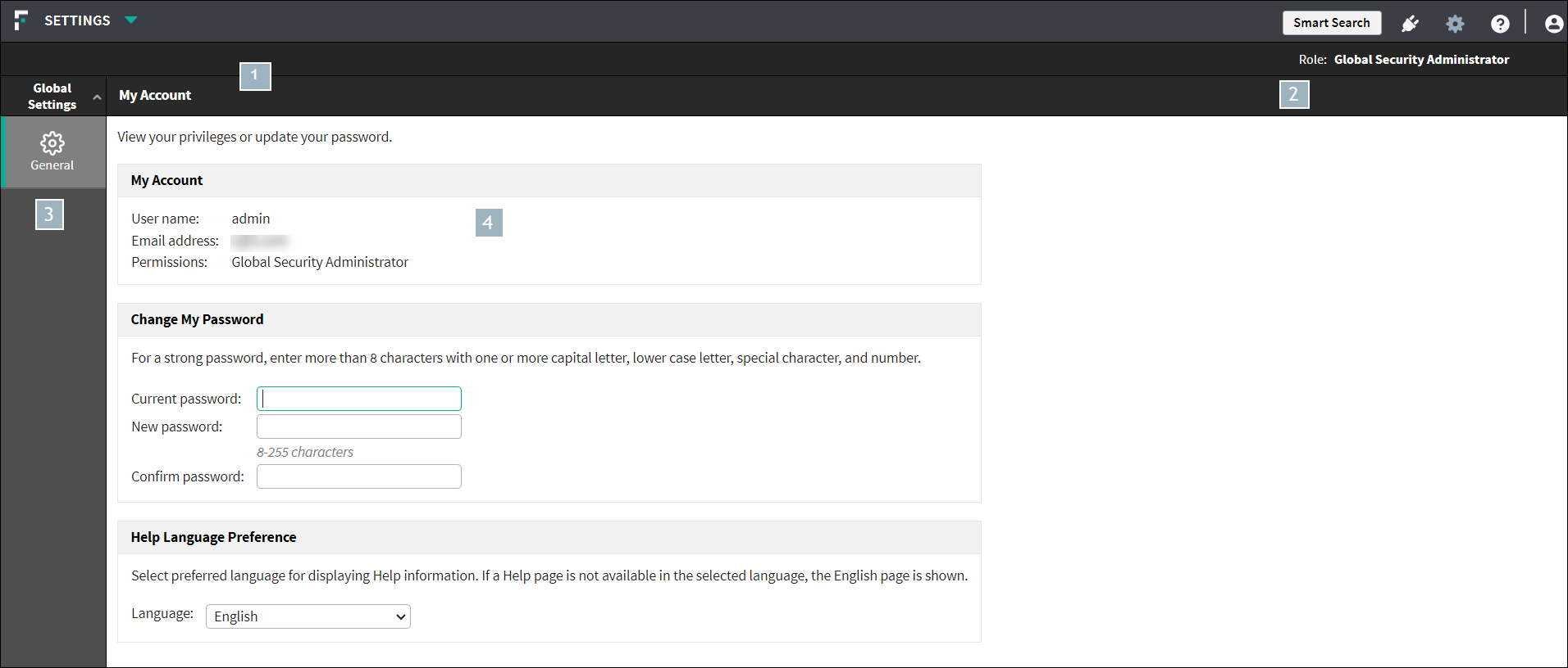 The Global Settings interface can be divided into four main areas. The following image displays the interface for Security Manager version 8.5.3 and later: