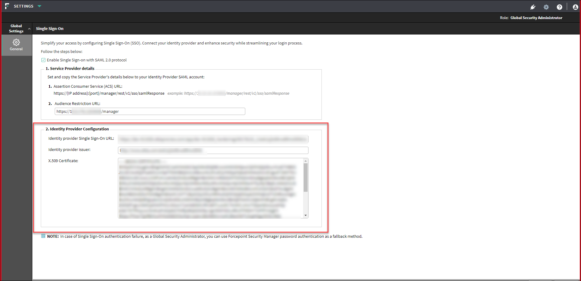 Open Forcepoint Security Manager and navigate to Global Settings > General > Single Sin-On.