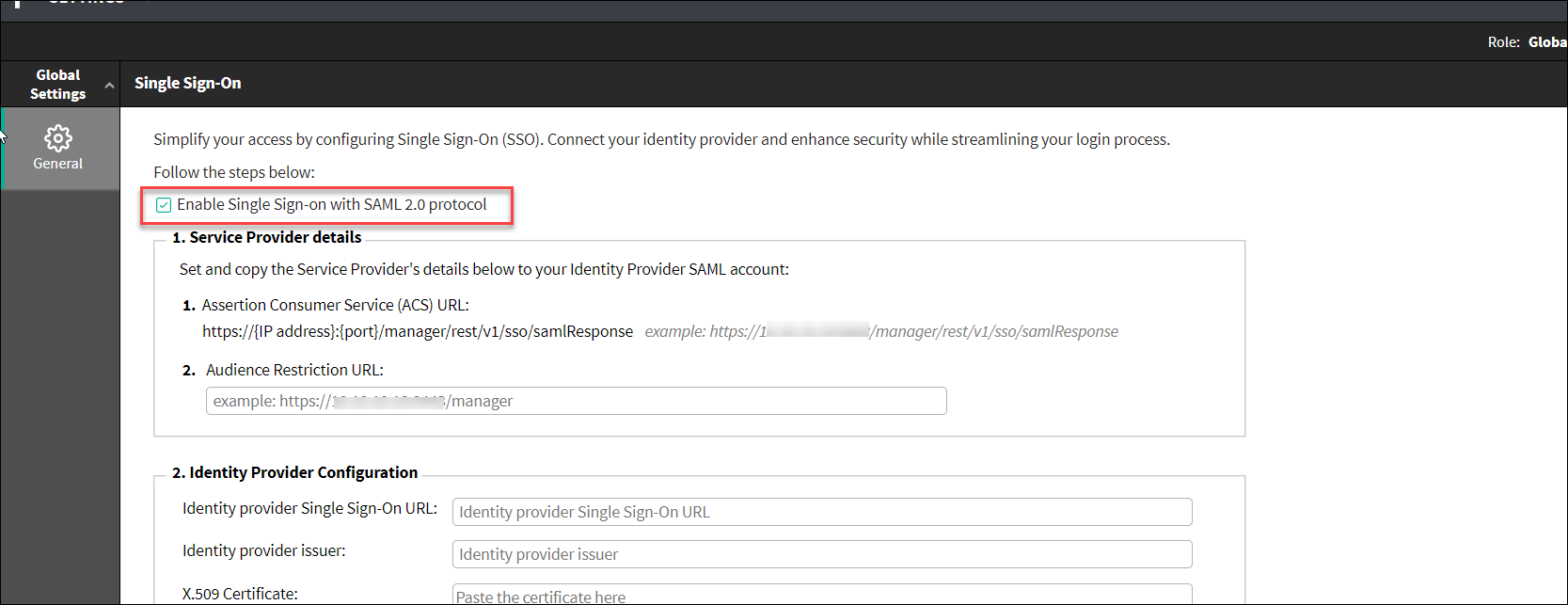 - Enable the SSO feature by selecting Enable Single Sign-on with SAML 2.0 protocol checkbox.