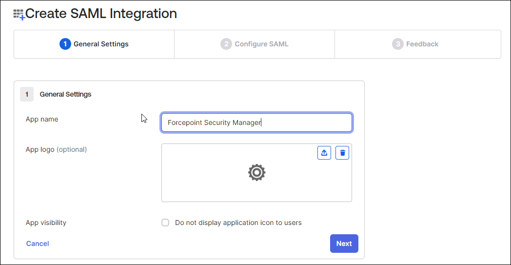 - In the App name field, enter the name of application e.g. Forcepoint Security Manager.