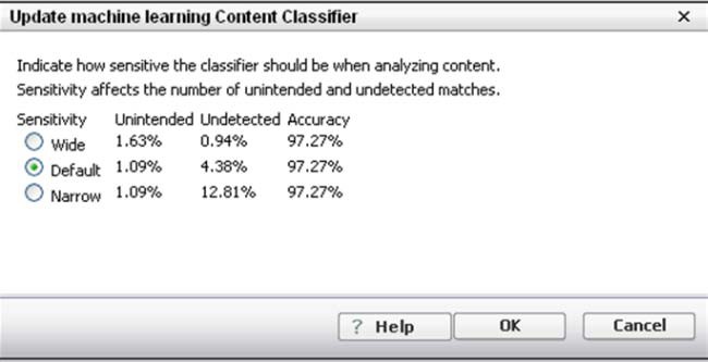 level, click Default, which opens the Update machine learning Content Classifier window: