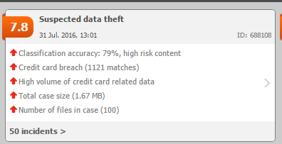 The risk for the case is evaluated by first assessing the total impact of all the incidents in the case and the probabilities for various scenarios (data theft case, false positive etc.). The following card summarizes a case with 50 incidents involving credit card data: