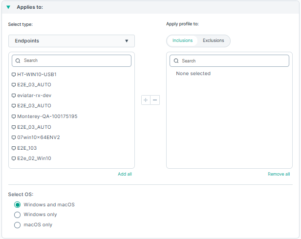 Use this section to define the scope to exclude or include in the profile. The scope defines the endpoints or organizational units which should be subjected to this profile.