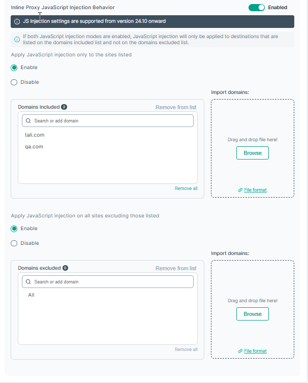 When the Inline Proxy JavaScript Injection Behavior attribute is ON, you can set a list of domains in which JavaScript inspection is applied, and a list of domains in which JavaScript inspection is bypassed. The options are: