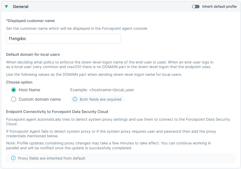 - Displayed customer name: Set the customer name that is displayed on the Forcepoint agent console.