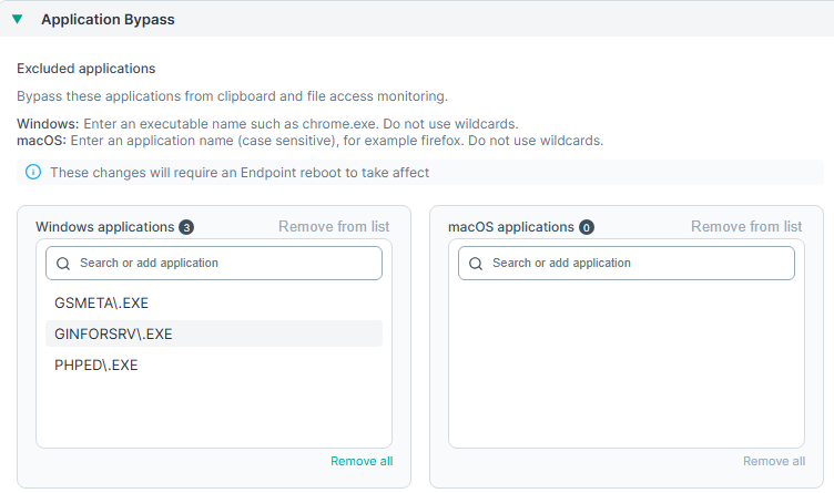Administrators can exclude specific applications from DLP monitoring on Windows and macOS endpoints.