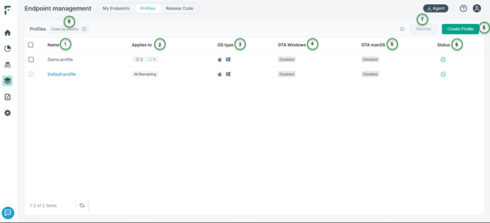 - Reorder: For a tenant there can be more than one profile created that applies for a given endpoint. The order of the profile sets its priority in this case. Click the Reorder and then drag the profiles up or down and then click Save.When scanning for the profiles to apply, the system checks from top to bottom in the list and selects the first profile that matches the organization the endpoint belongs to. In the above example, it may check if the endpoint belongs to the finance organization then allocates the first profile that is meant for the finance organization. If not, it checks if the endpoint belong to the IT department. If yes, then it allocates the second profile and it continues to check the next available profiles. If none of the profiles match, then the default profile is applicable.