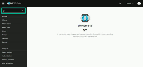 - Once you are logged in to Keycloak you are presented with the main page for the Master Realm. From the drop-down menu, select gv.