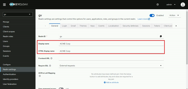 - From the General tab of the gv realm settings, change the Display name and HTML Display name to your company name and