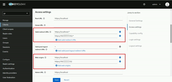 - Locate the Web origins field and select the Add web origins link. Enter in the IP address of your DSPM server. (e.g. https://<your_DSPM_IP>) This allows CORS endpoint calls to Keycloak from the DSPM dashboard.