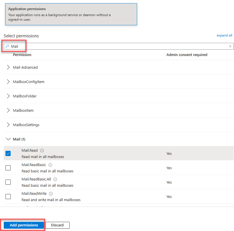 Permissions required - For Scanning Microsoft Graph > Application permissions > Mail > Mail.Read and click Add permissions. Microsoft Graph > Application permissions > User > User.Read.All and click Add permissions. Microsoft Graph > Application permissions > Directory > Directory.Read.All and click Add permissions. Microsoft Graph > Application permissions > DeviceManagementApps > DeviceManagementApps.Read.All and click Add permissions. Microsoft Graph > Application permissions > MailboxSettings > MailboxSettings.Read and click Add permissions.