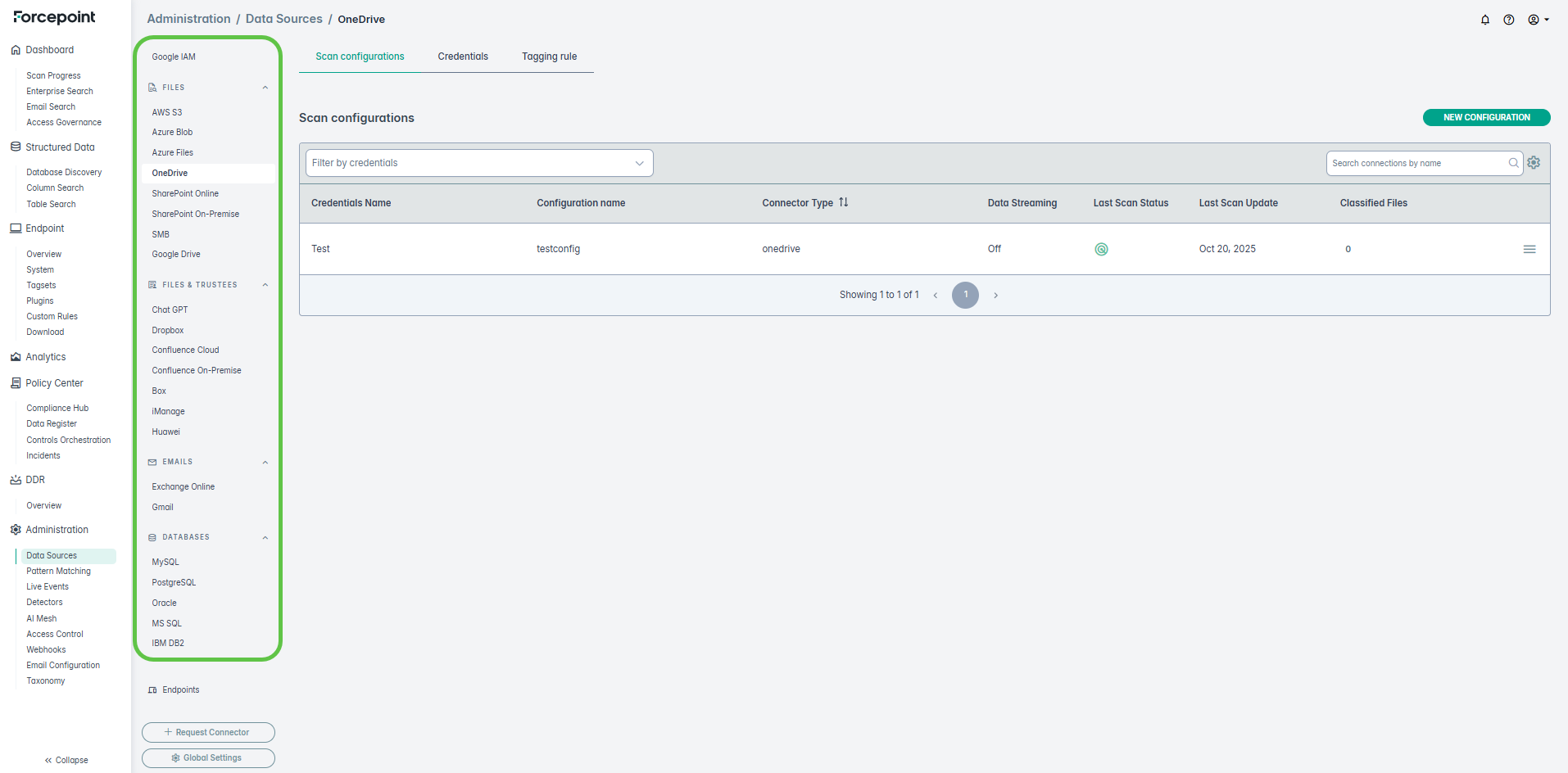 The various data sources for which you can configure connectors, are listed on the left navigation as shown below: