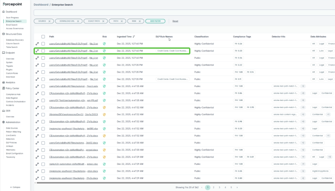 Once you have selected a specific DLP policy group(s) that you want to apply, you can next run a scan on the selected data source. If there is a policy hit, then it will display on the rule in the column DLP Rules Name on the Enterprise Search page.