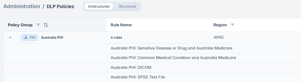 You can use the tabs Unstructured/Structured to view the policy groups for the unstructured data or the structured data.