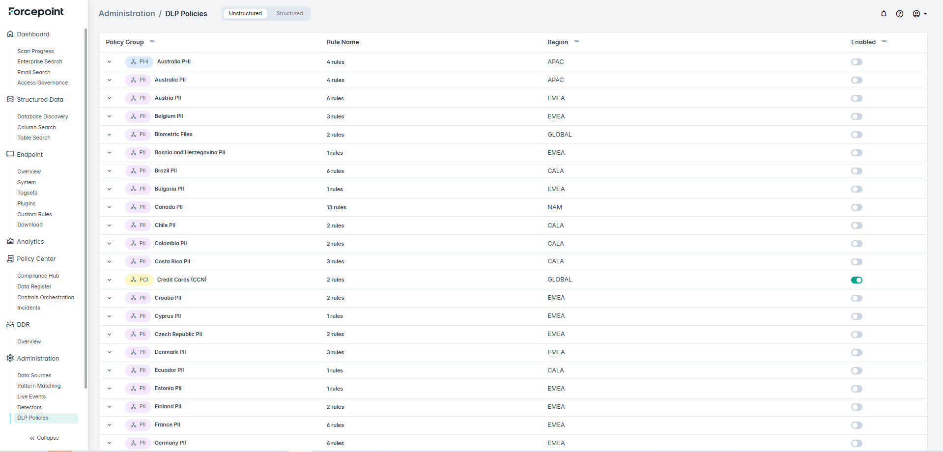 This feature allows users of Forcepoint DSPM to enable or disable DLP policy groups that apply on specific scan settings. Users can view all the DLP policies for Unstructured and Structured data under the Administration > DLP Policies page. By default, all the policies are enabled. You can enable/disable the policies selectively using the toggle button next to each listed policy.