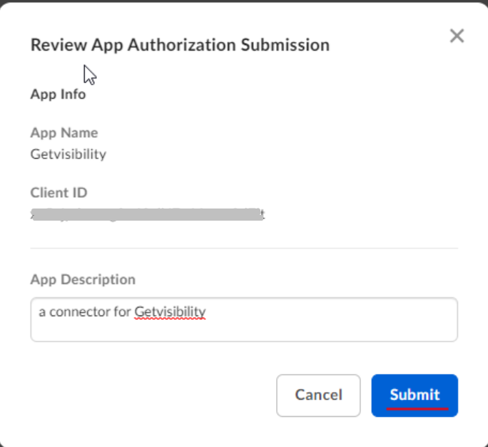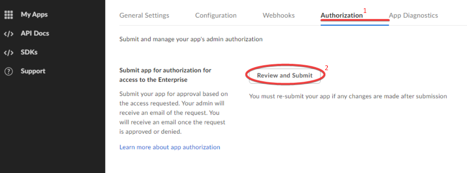 In Authorization tab, click Review and Submit followed up with adding a description before submitting the app for review.