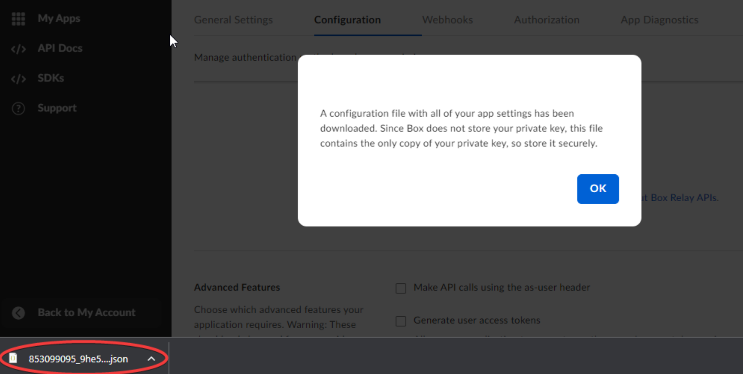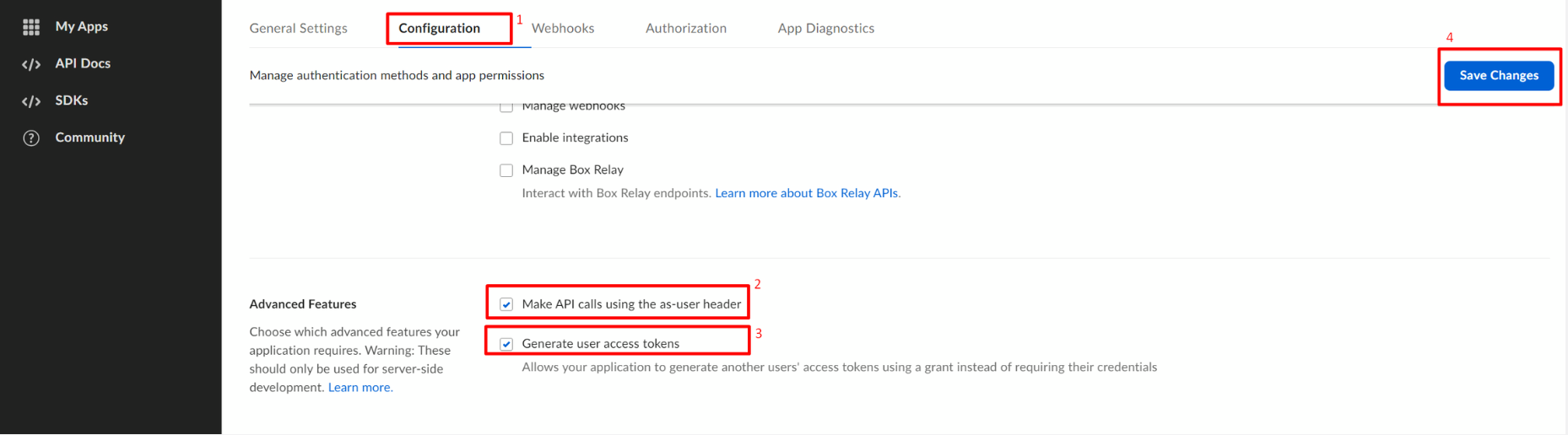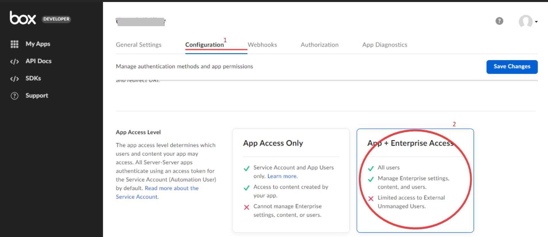 - In the Configuration tab, change App Access Level to App + Enterprise Access, then, enable Generate user access tokens and Make API calls using the as-user header.