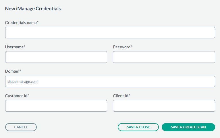 - Provide the Credential Name, Username, Password, DomainCustomer Id, and Client Id generated in the previous section from the iManage console.