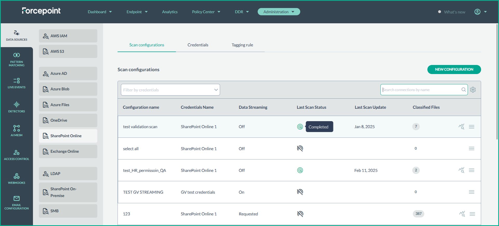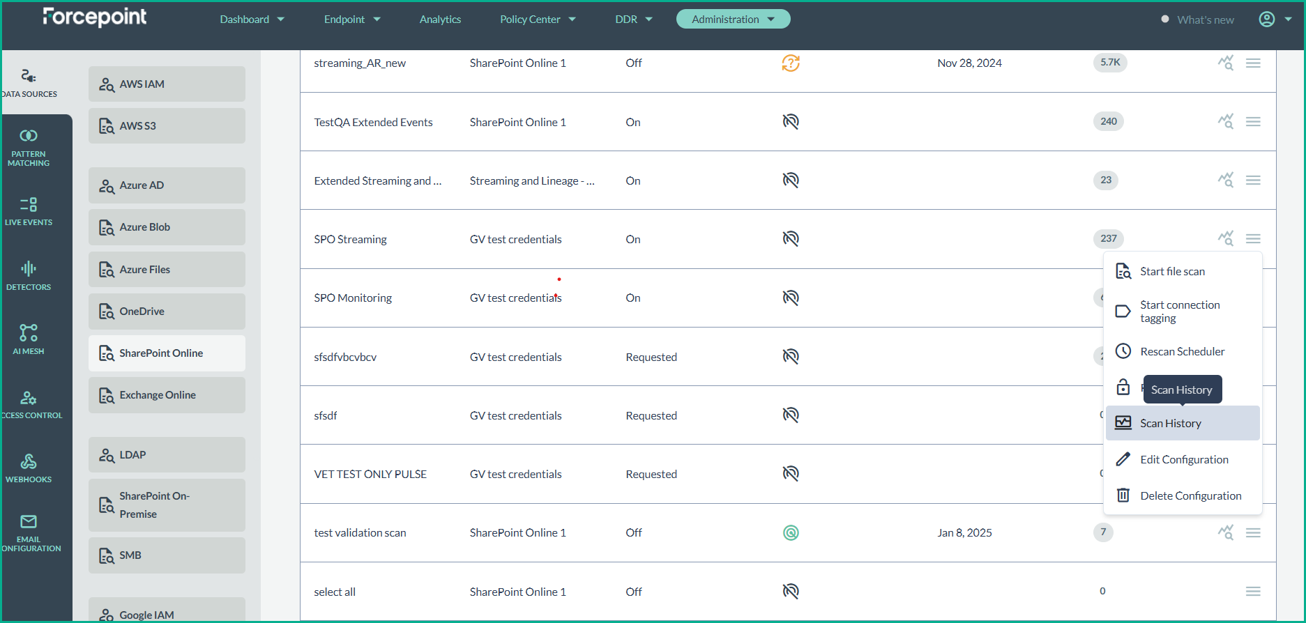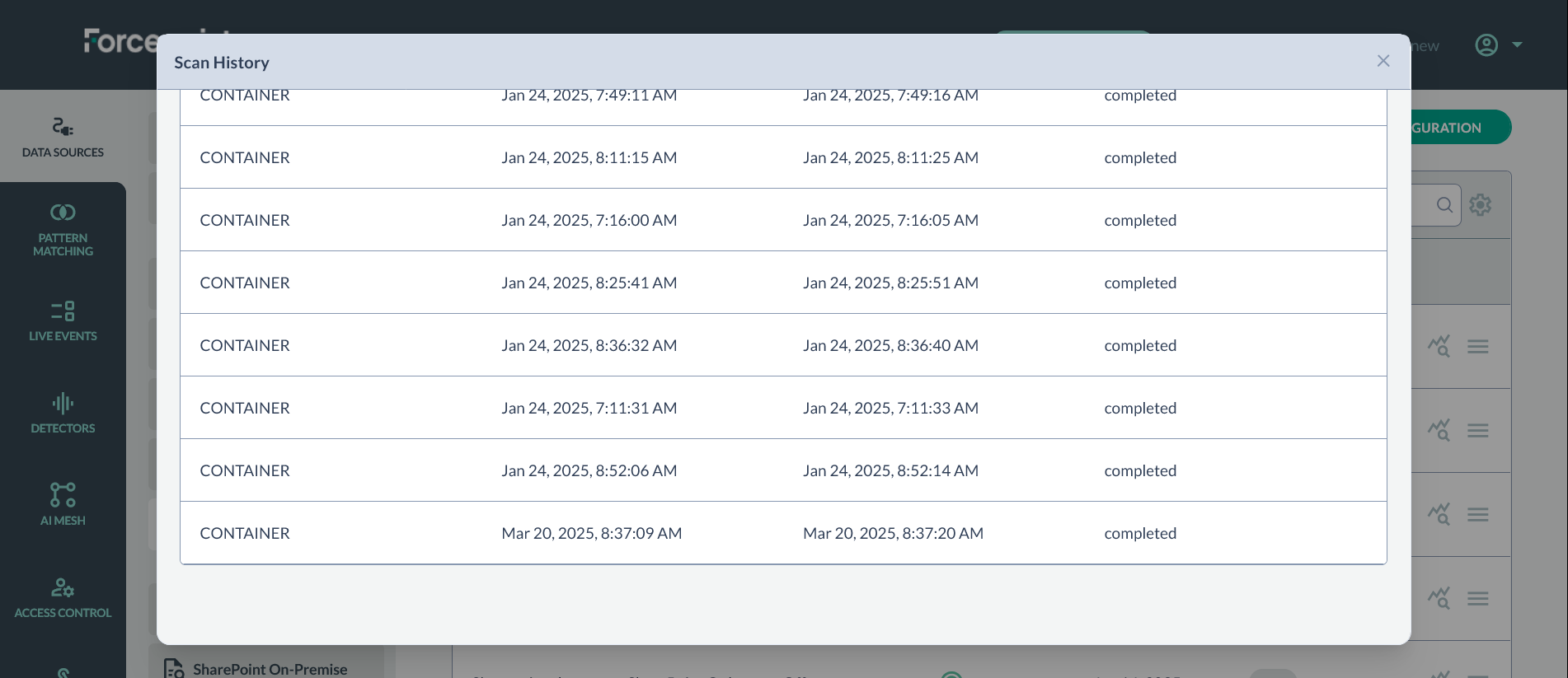 Scan History To find the history of scans performed on a Data Source complete the steps mentioned below: Steps Navigate to Administration > Data Sources. Click on a Data Source. Click on the Last Scan Status symbol. Click on the Hamburger Menu and select Scan History