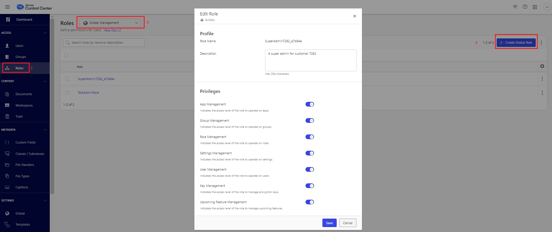 - Select Global Management to setup admin roles. Enable the necessary options.