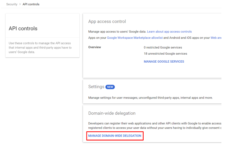 - In the Domain wide delegation pane, select Manage Domain Wide Delegation.