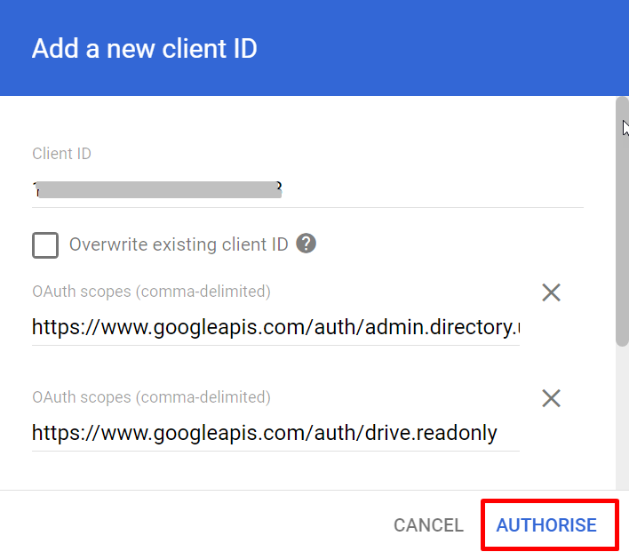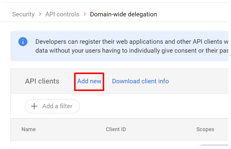 - In the Client ID field, enter the client ID obtained from the service account creation steps above.
