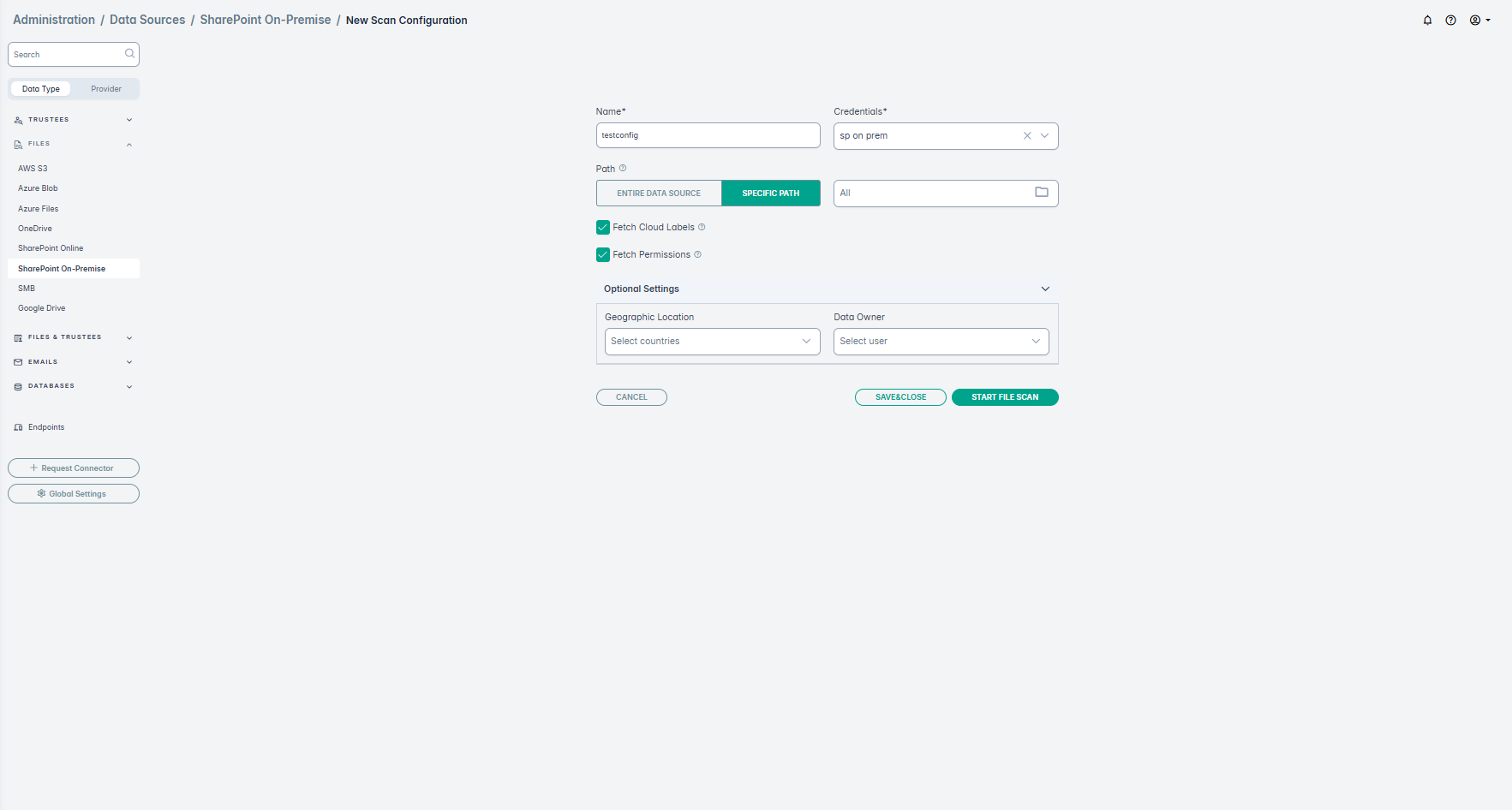 You can also edit the scan configuration created above later using Edit Configuration. For example, if you observe that you scans are running slow, you can go to the edit view and disable the options Fetch Cloud Labels and Fetch Permissions. - (Optional) You can select the Geographic Location and the Data Owner from the drop downs.