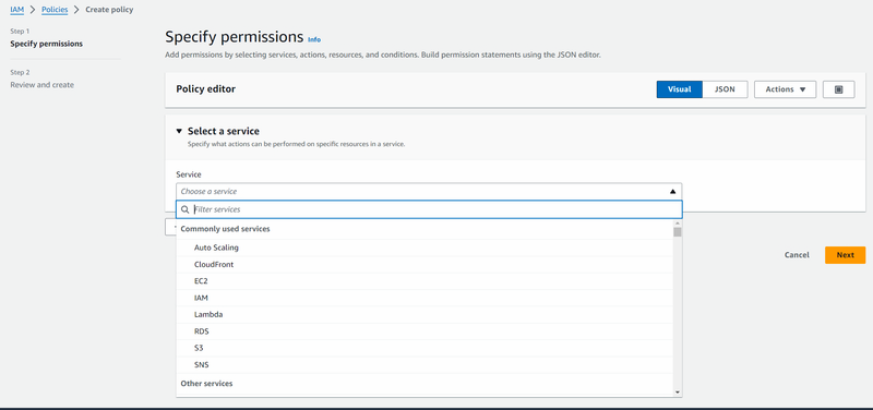 In the Policy editor section, find the Select a service section, then choose S3 service, and select