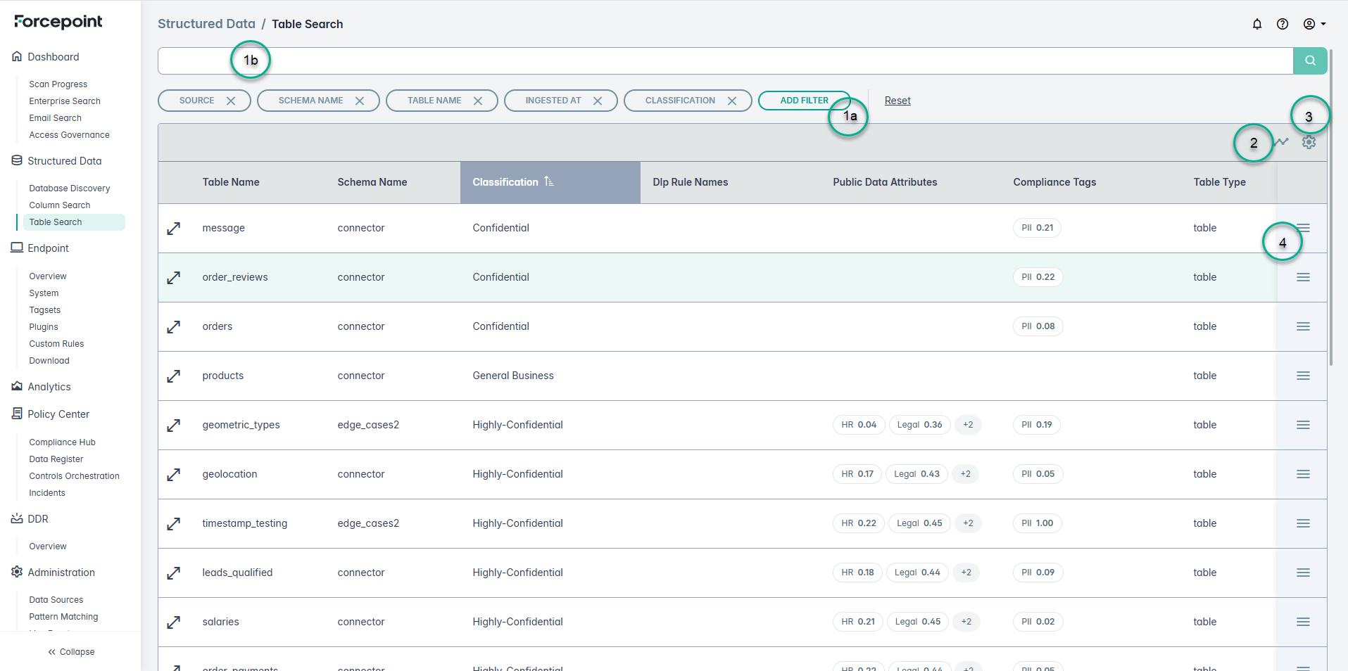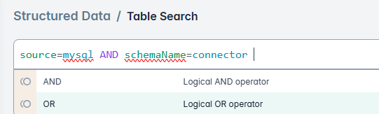 In the Table Search view, you can use GQL queries to filter and display selected tables, corresponding schema name, classification and other details. Following is an example: