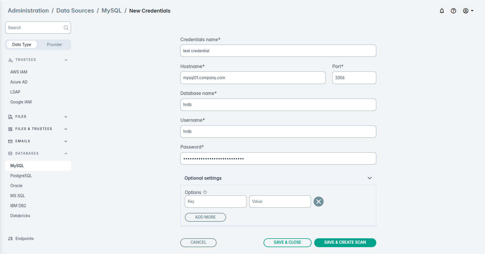 - Credentials name — any unique name, e.g., `PROD HR DB Credentials`