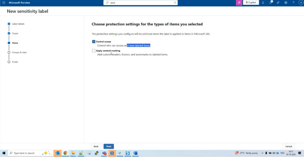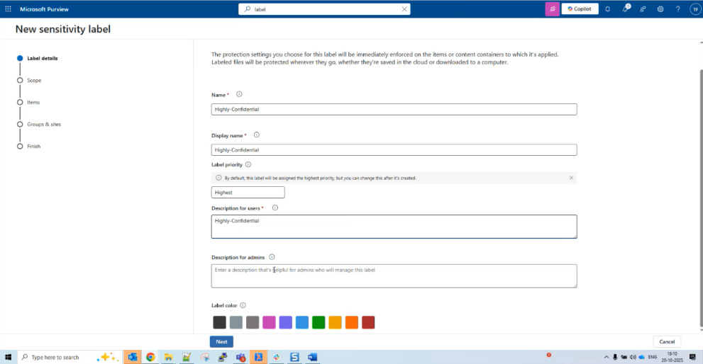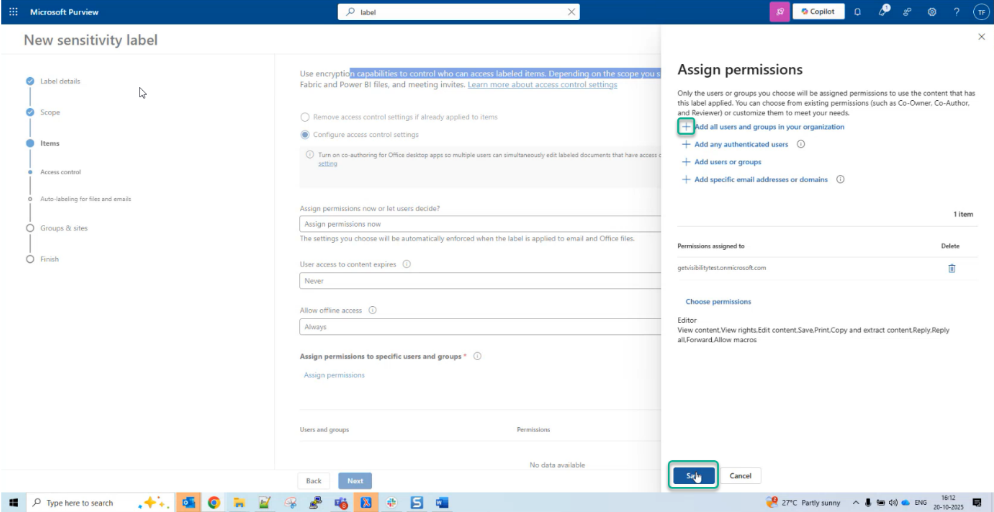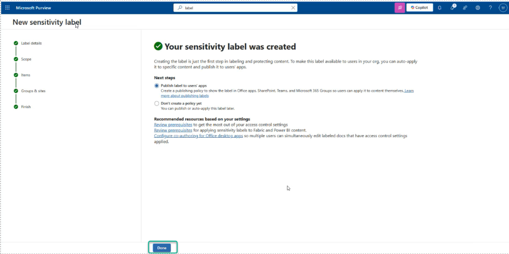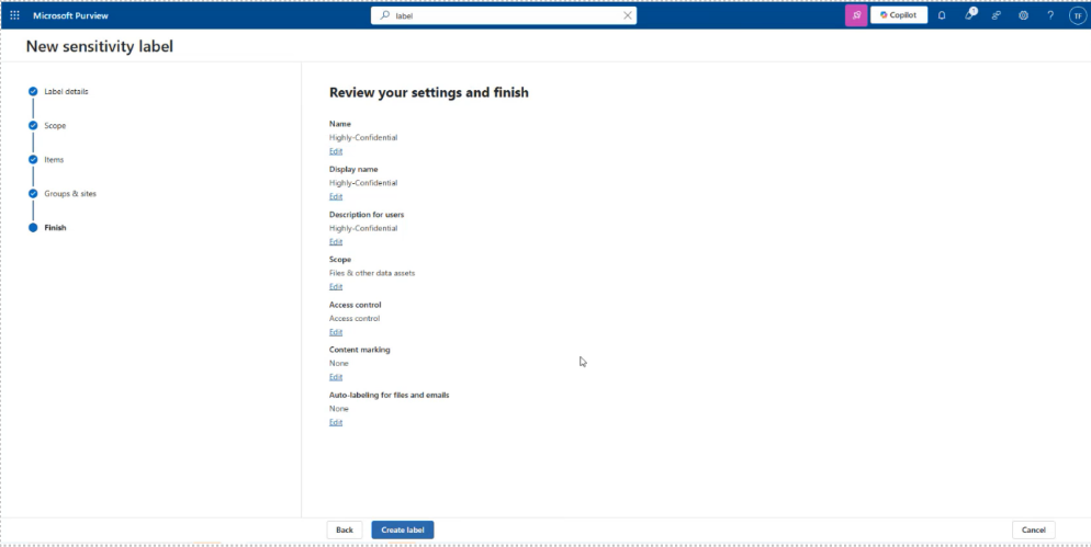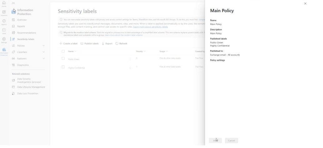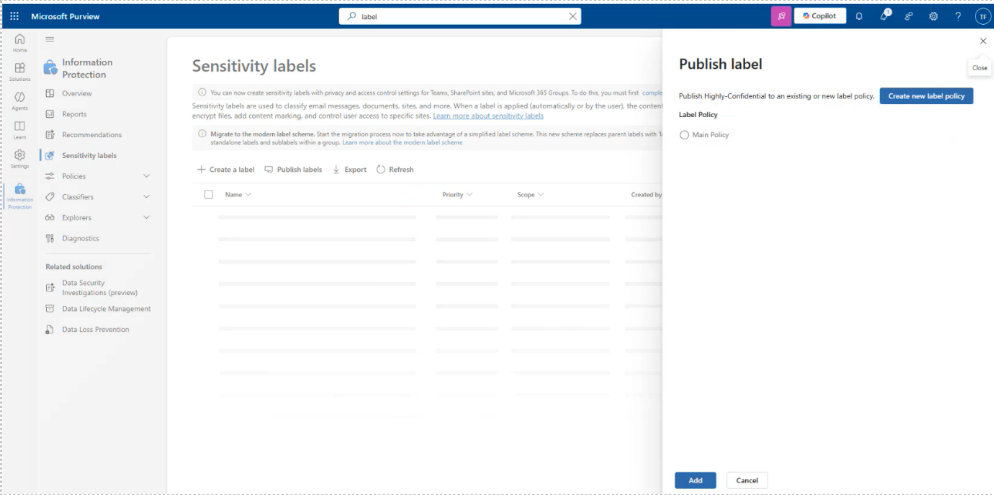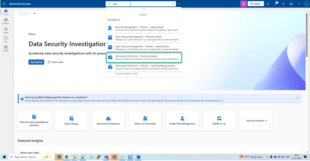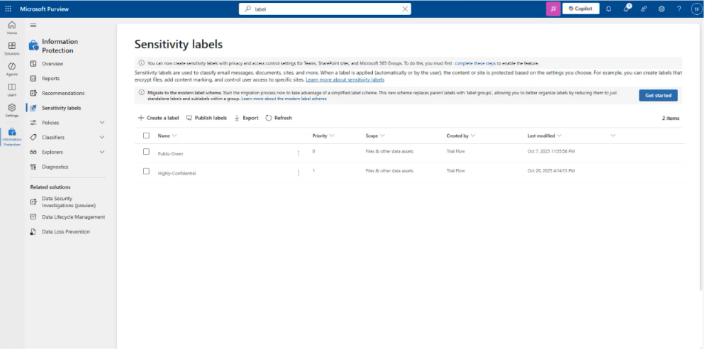 Check if MS Purview labels are already present or create (if necessary) as explained in the steps below: