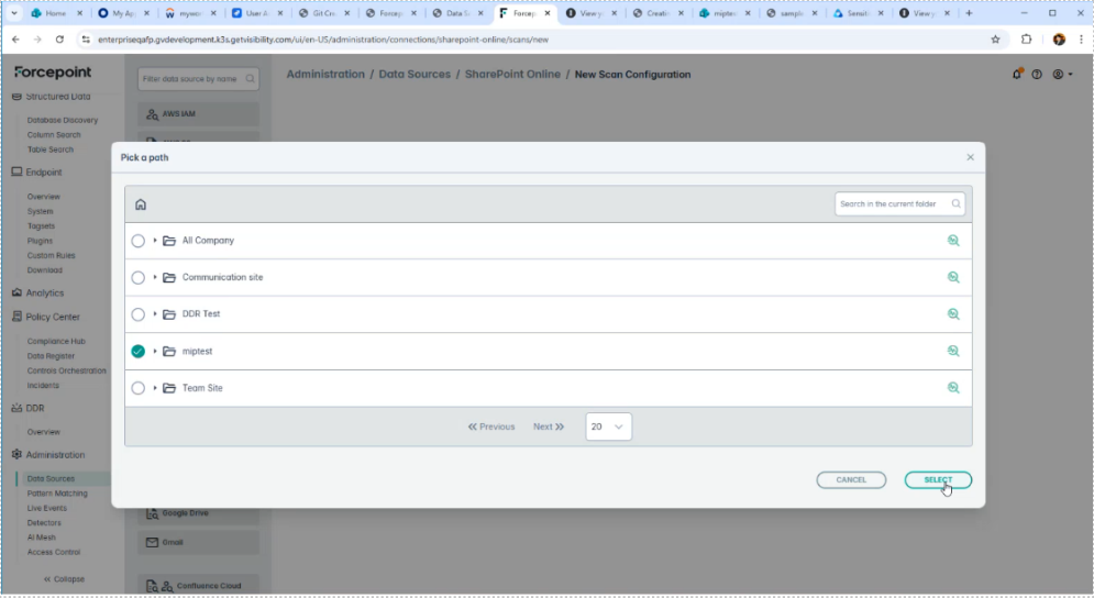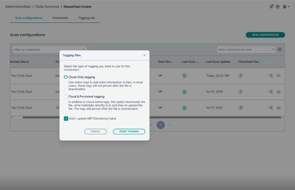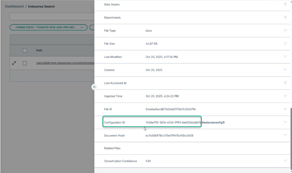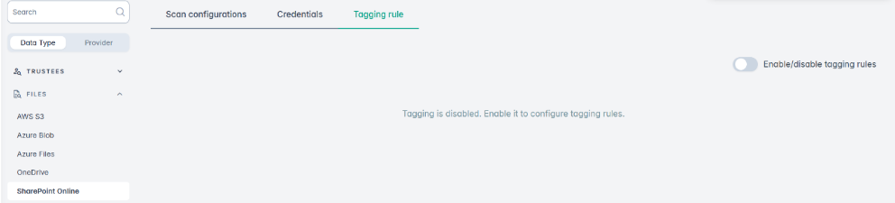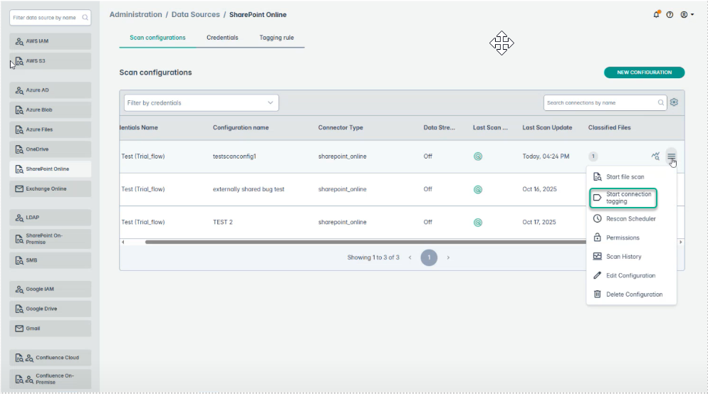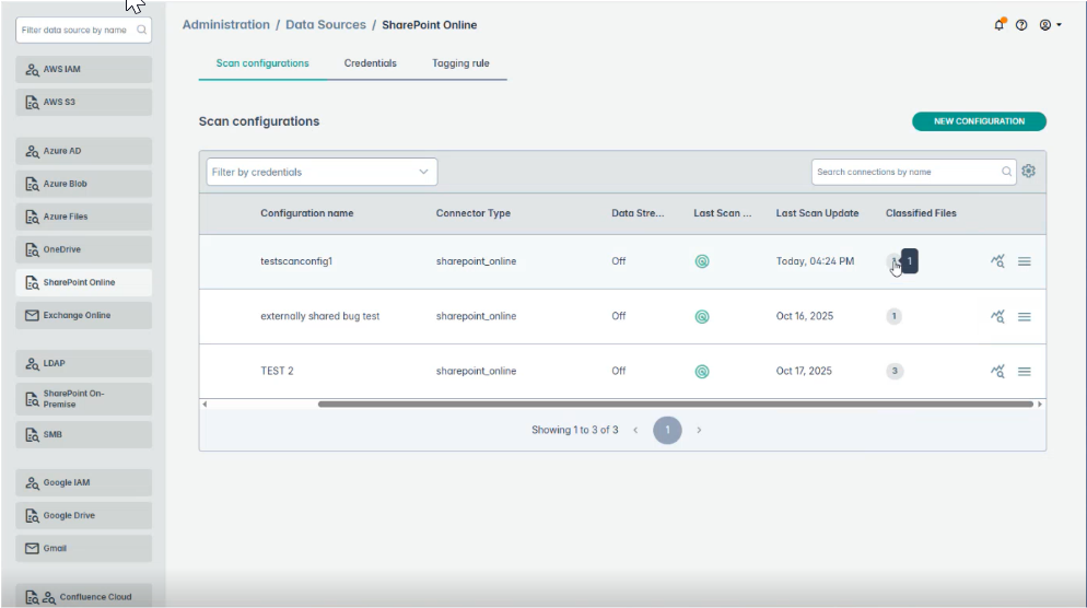 - Ensure that you have a scan configuration setup as explained in section: Configuring SharePoint Online connector in Dashboard.