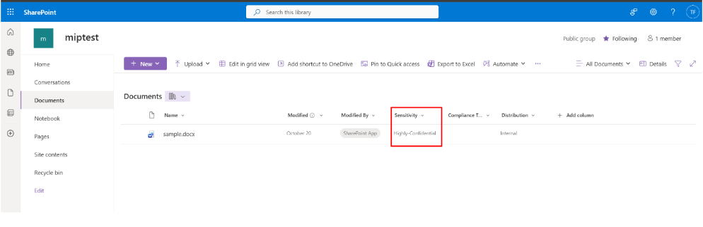 - When tagging is applied successfully, you will see the Sensitivity applied on the SharePoint site.