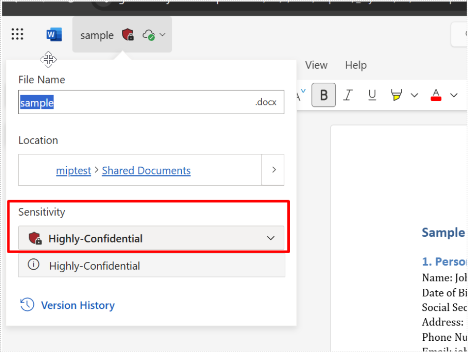 Once you have checked for the labels in Purview, you can now navigate to SharePoint and open any file to check if they are now listed. An example, is shown below: