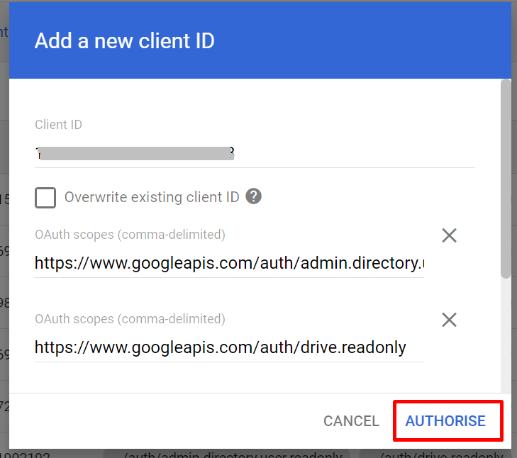 - In the Client ID field, enter the client ID obtained from the service account creation steps above