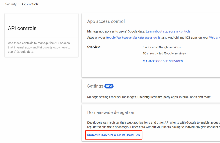 In the Domain wide delegation pane, select Manage Domain Wide Delegation.