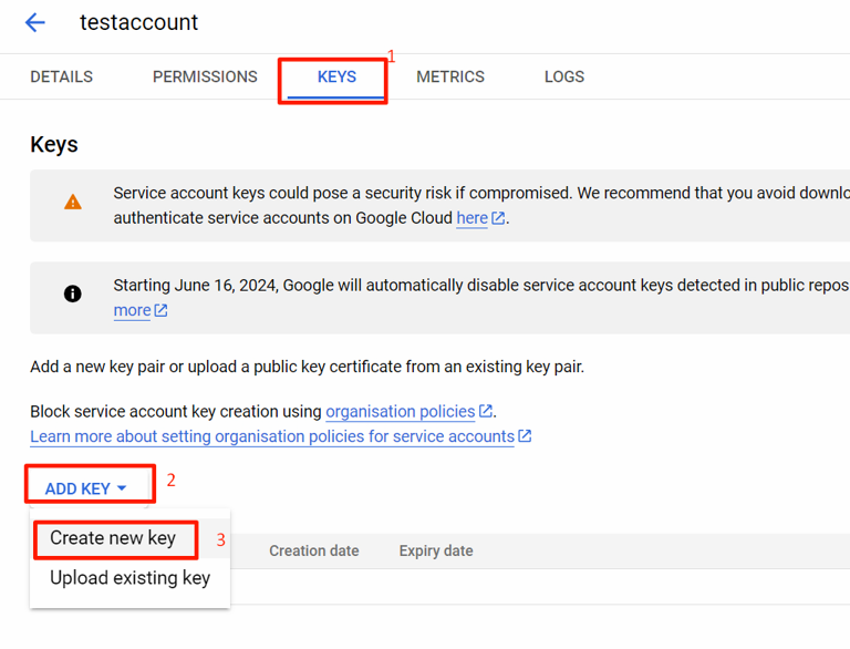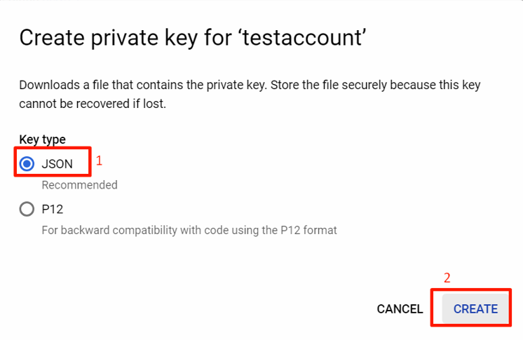 Select the newly created service account and click Keys > Add Key > Create new key.