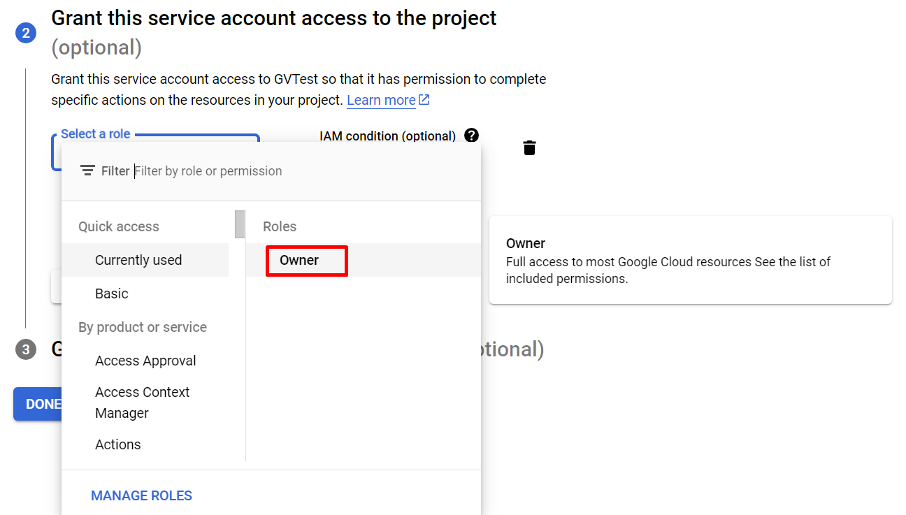 Under Grant this service account access to the project select role as Owner and click DONE.