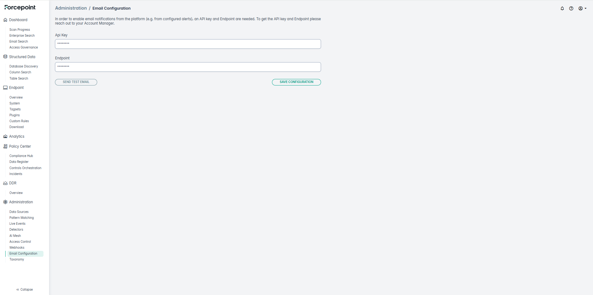 In order to enable email notifications from the platform (e.g. from configured alerts), an API key and Endpoint are needed. To get the API key and Endpoint please reach out to your Account Manager.